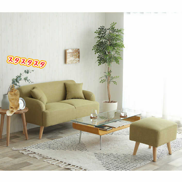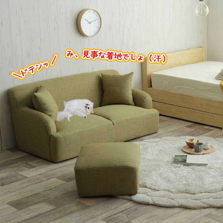 グリーンのオットマン付き2人掛けソファーはミニクッションが2つも付属してましゅ!