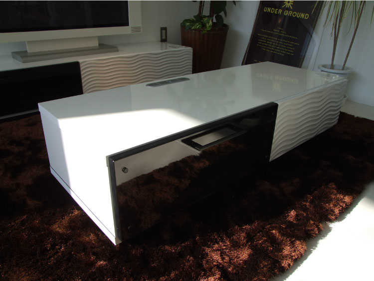 白のウェーブデザインとブロンズガラスを組み合わせたテレビ台は、高層マンションに住んでいる人のお家にありそうな都会的なデザインで超かっこいい!